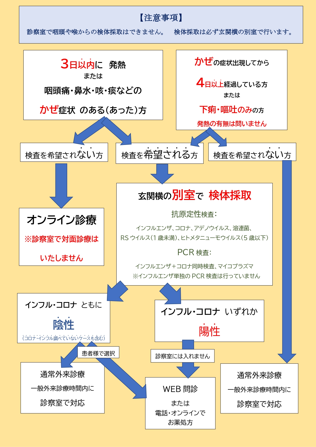 通常診察の順番で診察室に入ってから「コロナやインフルエンザの検査希望」とお伝えいただいても検査はできません。